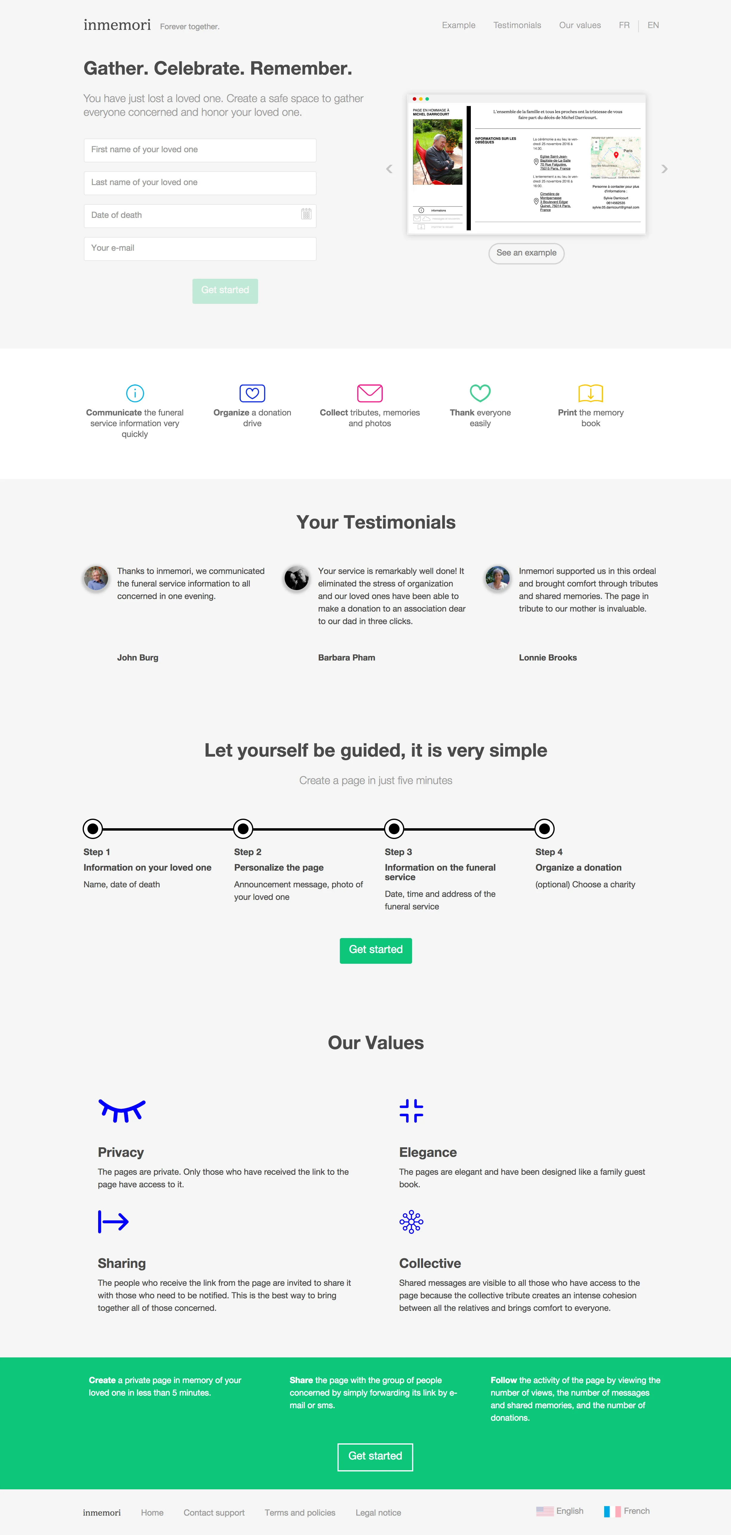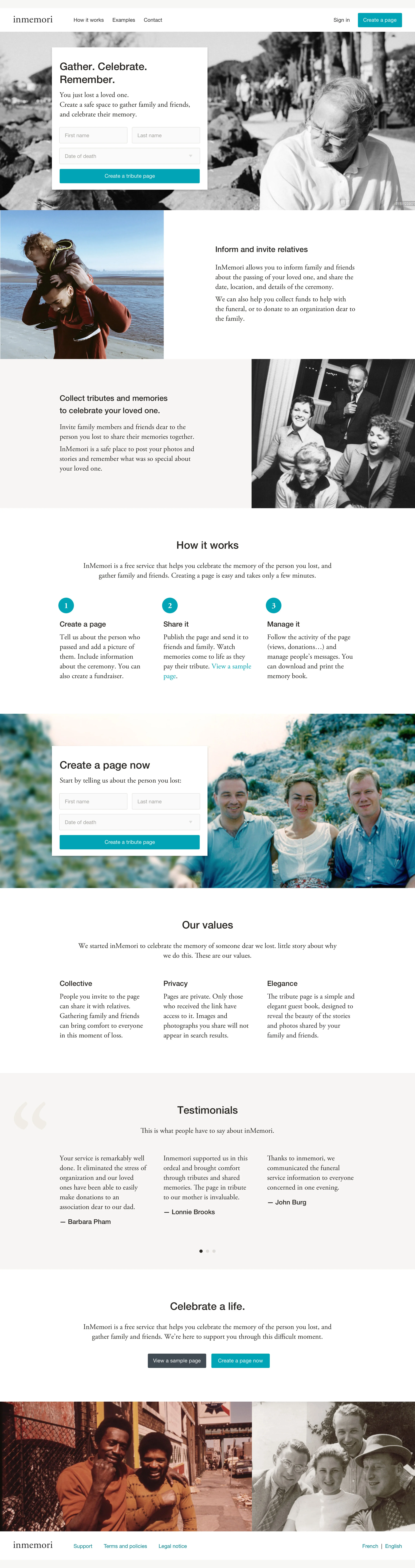 InMemori hired me to redesign their home page. InMemori allows people who just lost a loved one to create a page to collect tributes and memories from family and friends.